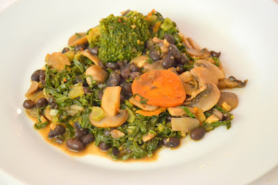 * Juntar a cenoura, os cogumelos, a couve e os brócolos e misturar;